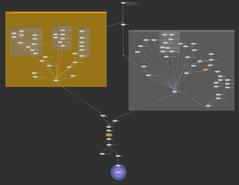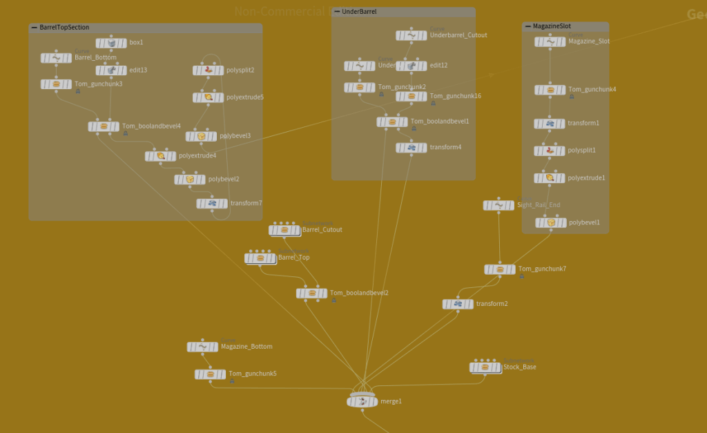 Below is an outline of the network for the entire project with the asset split into two key sections with the yellow representing the matte powder coated components of the gun and the grey representing the shiny metallic components. Structuring the project this way made it much easier to texture when the asset was exported into Substance Painter, and also allowed me to make changes to specific components as needed.