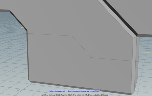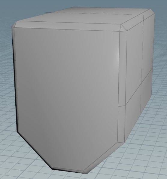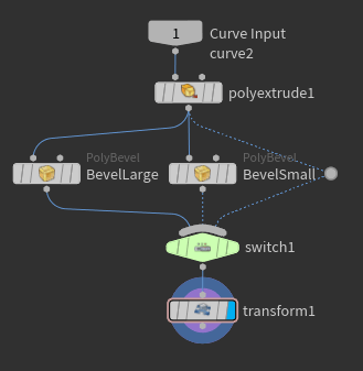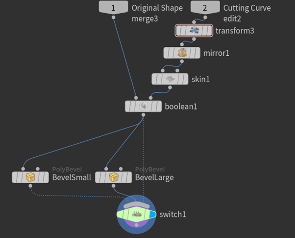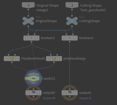 Next I created the “BoolAndBevel” SOP which allowed me to carve out some more detail in the model and give it a more interesting shape. The SOP takes two shapes; the cutting shape, and the shape to be cut. Then, it outputs the new shape with a chunk cut out of it and the overlapping section of the two shapes also offering the user varying levels of bevel for more detail.