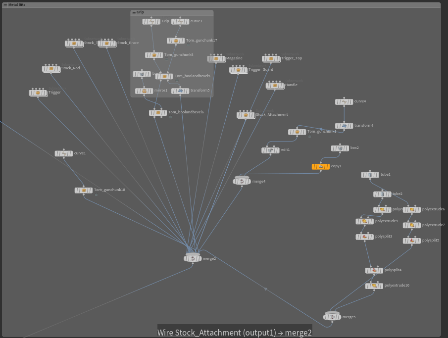 The final tool I constructed was the “BevelSeam” SOP which allowed me to add the final details to the geometry by using a curve to cut grooves through the geometry and bevel them to varying degrees in order to give the feel that the gun was made of a series of modular pieces built together.